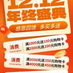 消费满1000元送100元购物卡 消费满2000元送200元购物卡 消费满3000元送350元购物卡 消费满4000元送450元购物卡 消费满5000元送700元购物卡 消费满6000元送800元购物卡 【活动规则】 1. 活动时间:12月12日-12月25日 2. 参与对象:时...